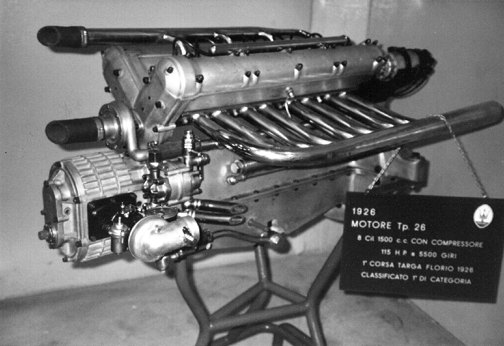 Le moteur de la Tipo 26 est un 8 cylindres en ligne de 1.5 litres avec deux arbres à cames en tête et un compresseur Roots devant le moteur. Ce compresseur comprime le mélange air-essence fourni par les deux carburateurs Memini que l'on voit en bas au premier plan et le mélange comprimé est envoyé sans être refroidi vers l'admission sur le flanc droit du moteur. Avec un rapport de compression de 5.8 : 1, la puissance délivrée atteignait 120 cv à 5300 tr/mn ce qui, en 1926, représentait un beau rendement de 80 cv au litre, obtenu à une époque où le standard tournait autour de 30 à 40 cv au litre. Le moteur est presque carré avec un alésage à 60 mm pour une course à 66 mm ce qui autorisait un régime de rotation assez rapide (5300 tr/mn) par rapport aux moteurs de l'époque qui étaient souvent à course très longue.