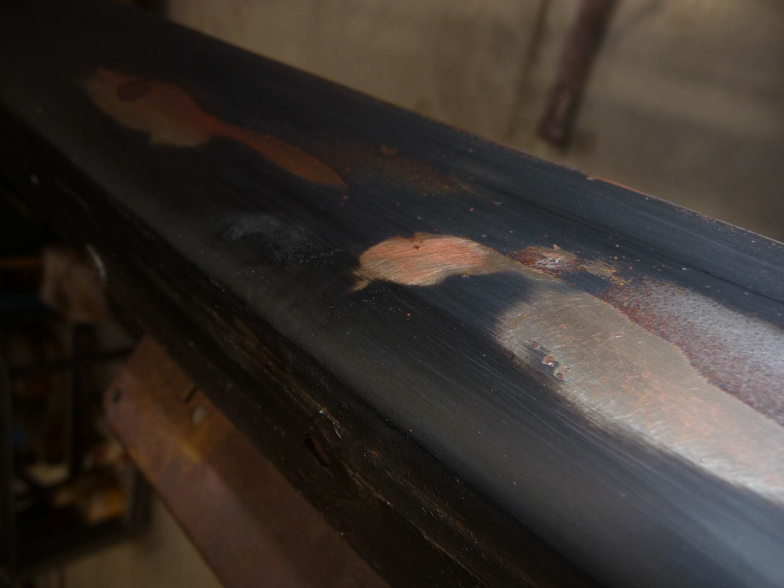 On distingue clairement les différentes couches: la peinture noire, la couche de chrome gris-argent qui a été laissée juste dessous (et sans doute nickel de couleur similaire), la couche de cuivre d'accrochage si c'est poncé plus en profondeur et enfin l'acier corrodé, par piqûres en certains endroits sous le cuivre, ou sur de larges surfaces: