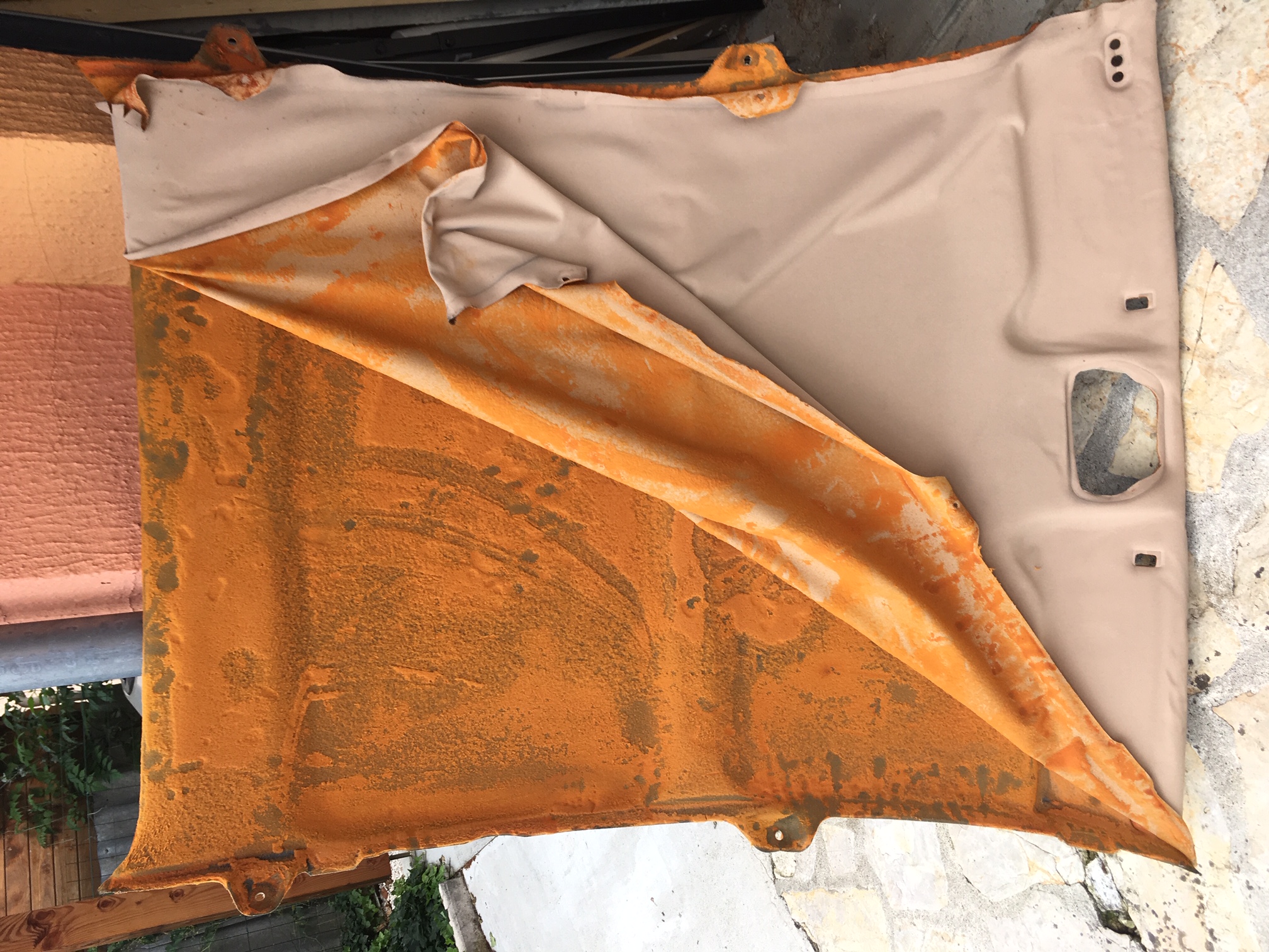 J'ai décidé de démonter la banquette AR et les garnitures AR pour bien accéder à l'ensemble du ciel de toit. C'est du boulot mais ça se fait bien et on arrive ensuite à sortir le ciel de toit de la voiture. Cette mousse qui se délite entre le support et le tissus est vraiment dégueux et il faut faire attention de ne pas en mettre dans la voiture ou sur les sièges.