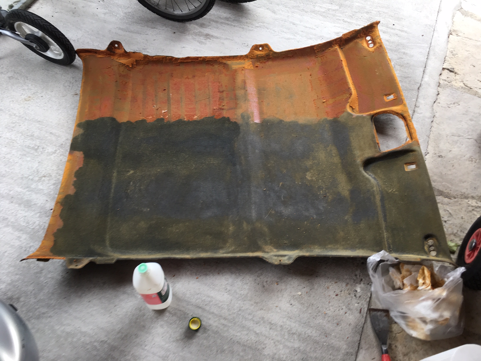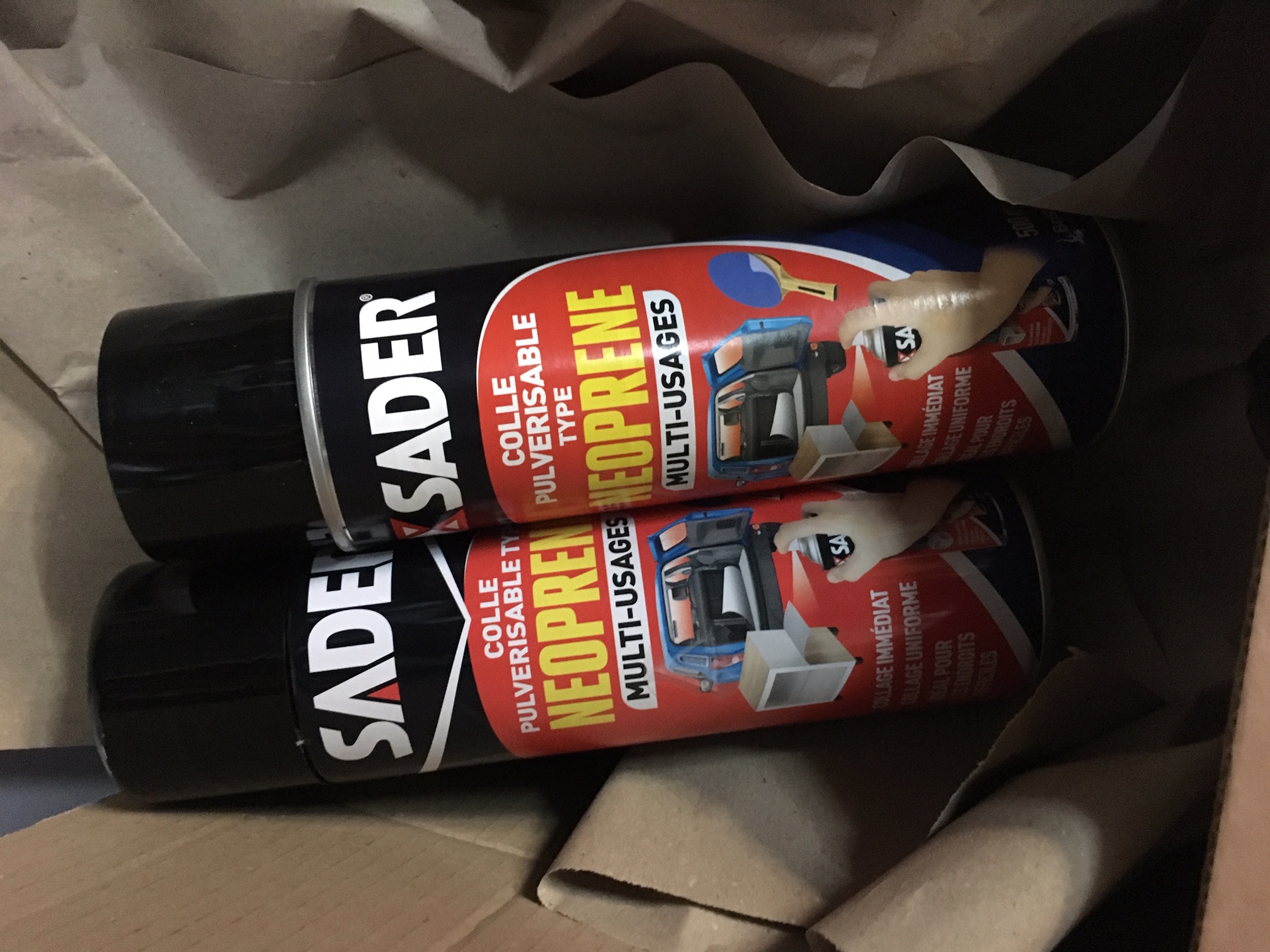 Après 1 nuit de séchage, j'ai recollé le ciel de toit avec de la néoprène en spray. Il m'aura fallu 2 aérosols de 500ml.