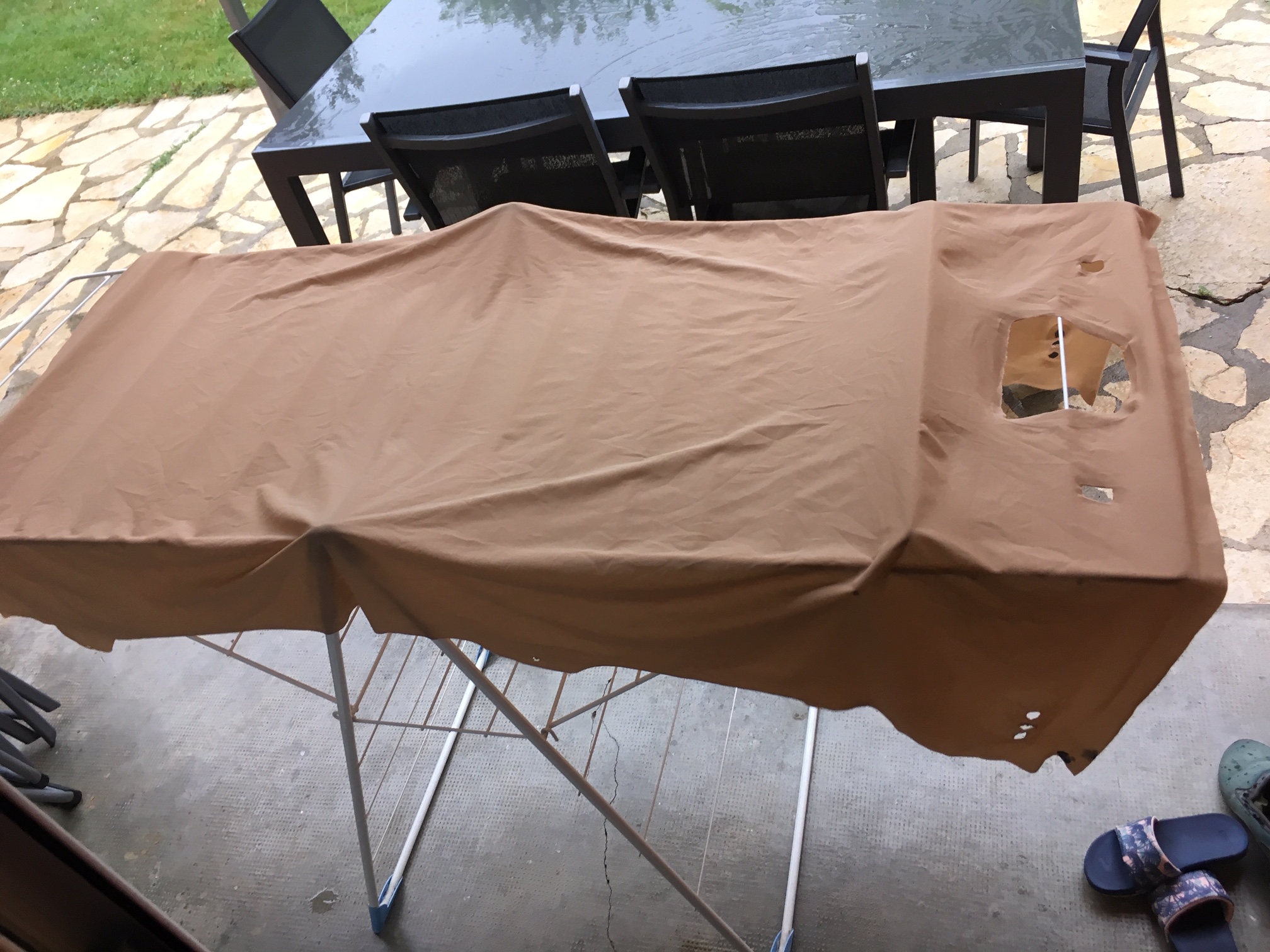 Ciel de toit en tissu technique pour ma part. Sauf que... ce n'est pas aussi simple qu'ici car le tissu s'est totalement rapiécé ! Impossible de le tendre pour atteindre les bords du support :?