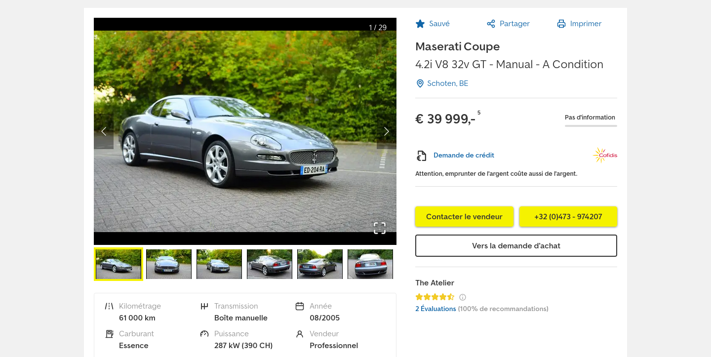 en vente en Belgique , Maserati Coupe Gt Boite Manuelle 4.2i V8 32v GT 08/05 Grigio Alfieri Nero 61851 kms 39999 €