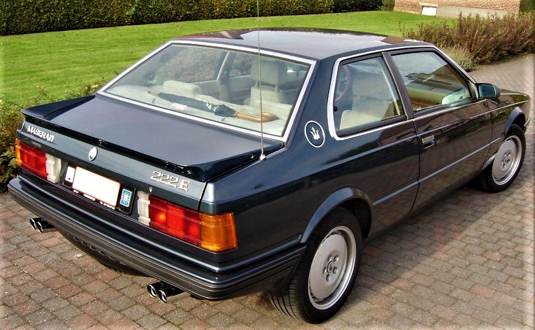 La 222 E conserve les pare-chocs avant et arrière échancrés, l’échappement n’est pas caréné. A noter le becquet arrière non ajouré, comme sur les Biturbo Si et les 222 de 2 litres.