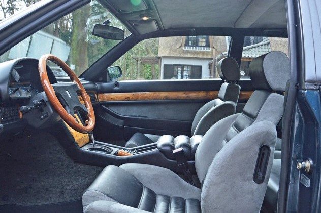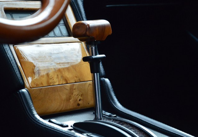 Bois sur le volant et le levier du frein à main, pas encore sur la console (la 222 E de Philippe est de 1989). La boite reste la ZF 5 vitesses à première vers soi. Sur les 222 E, 222 SE et 222 SR c’est de série cuir au centre des sièges « pétales » et Alcantara sur les côtés :