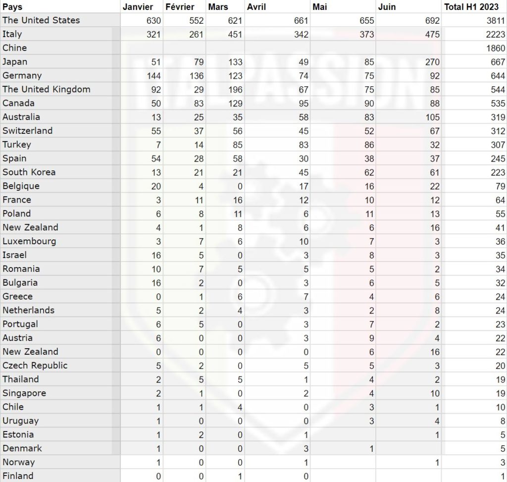 Le site italpassion.fr publie l'ensemble des chiffres de vente mondiaux (hors Moyen-Orient) du premier semestre, confirmant la faible position de la France.
