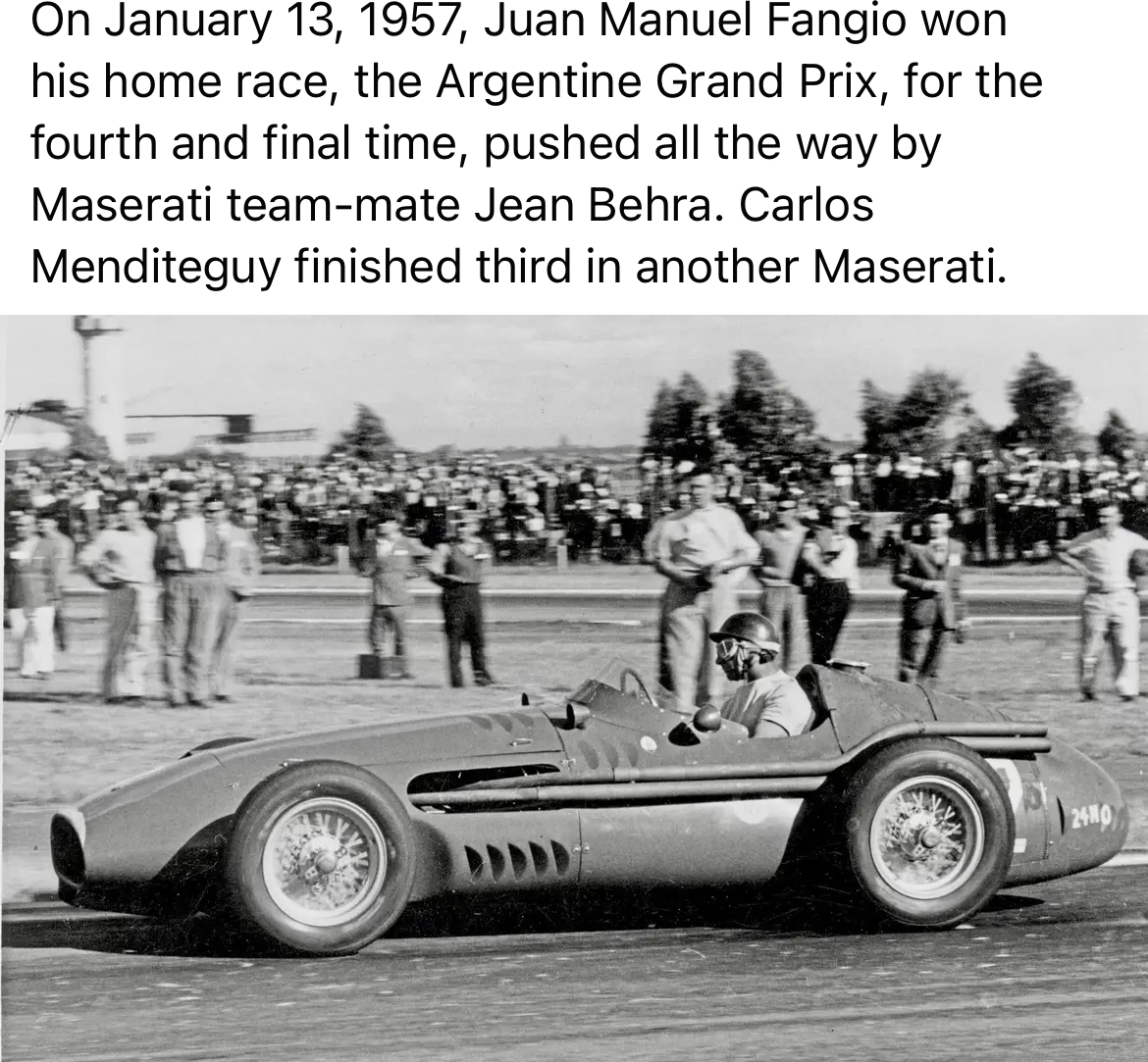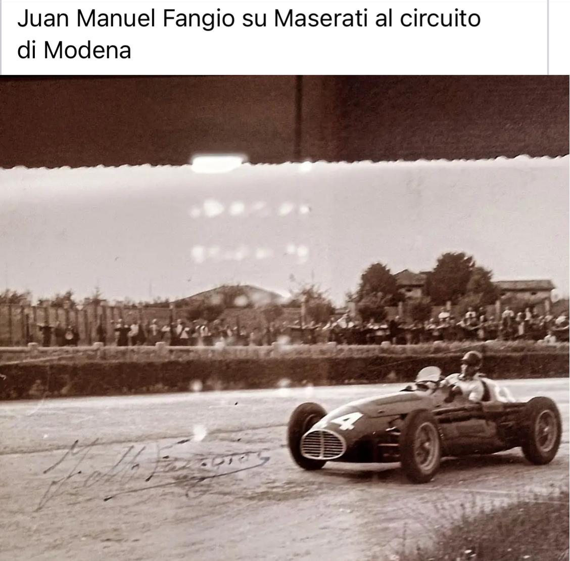 Juan Manuel Fangio était argentin mais sa famille était originaire des Abruzzes en Italie. Bien qu'il ai courru et vaincu sur des autos de diverses marques, la firme Maserati fut toujours particulièrement chère à son cœur. Il a souvent dit qu'' il se sentait chez Maserati comme à la maison" ! Depuis les 4CLT que l'automobile club d'Argentine avait mises à sa disposition jusqu'à la 250F avec laquelle il remporta son cinquième et dernier championnat du monde de Formule 1 en 1957, Maserati lui apporta des victoires et il en offrit à Maserati.