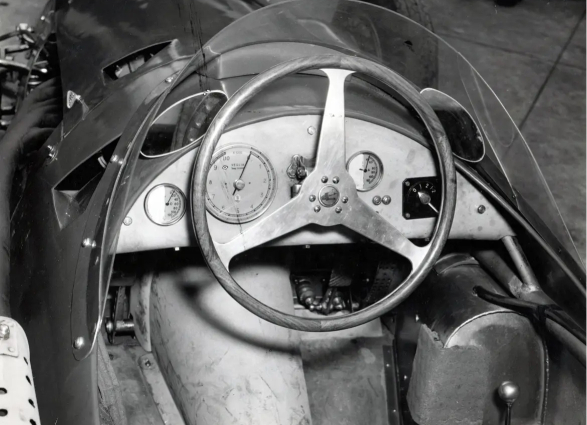 Petit retour sur la 250F #2520 photographiée ci-dessous à l’usine Maserati sur les deux premières photos puis achetée d’occase et à Melbourne en juin 1956. On notera que les rétroviseurs sont placés à l’intérieur du saute vent, pour des raisons aérodynamiques mais quelle efficacité ?