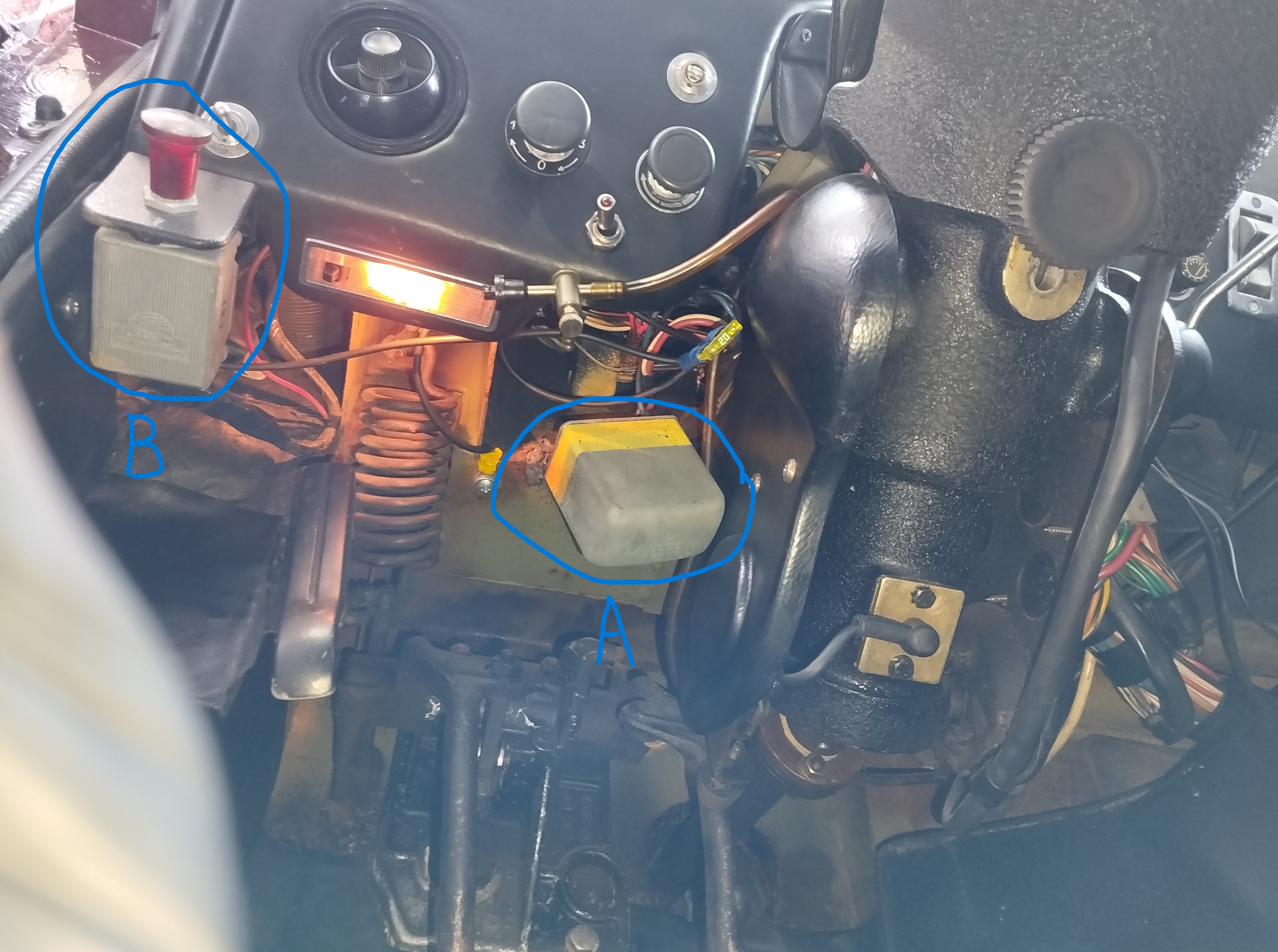 Rien non plus qui corresponde côté conducteur, que ce soit à gauche de la colonne de direction où on voit le régulateur (en A), et une sorte de contacteur de sécurité, peut-être le warning (en B):