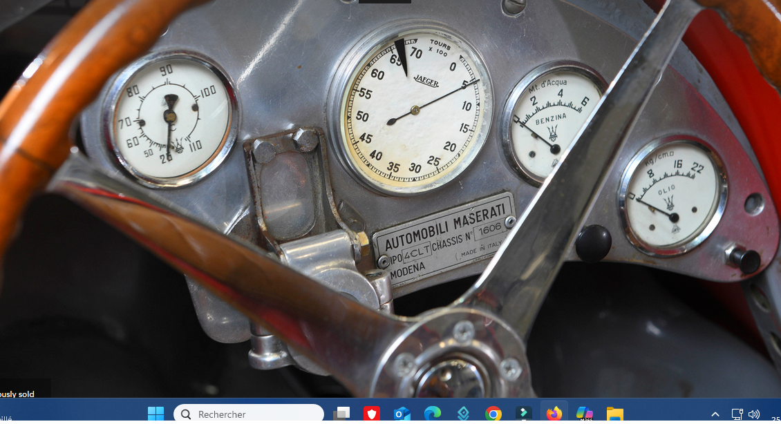 Derrière la boite de vitesses, un cache enveloppe le début de l’arbre de transmission. Ci-dessous sur la 4CLT/48 #1606 ex-Louis Chiron, nous avons de la gauche à la droite la température d’eau, le compte tour avec limite à 6600 tr/mn, l’essence et la pression d’huile : Sur celle-ci, un nouveau manomètre anachronique a malheureusement été rajouté :
