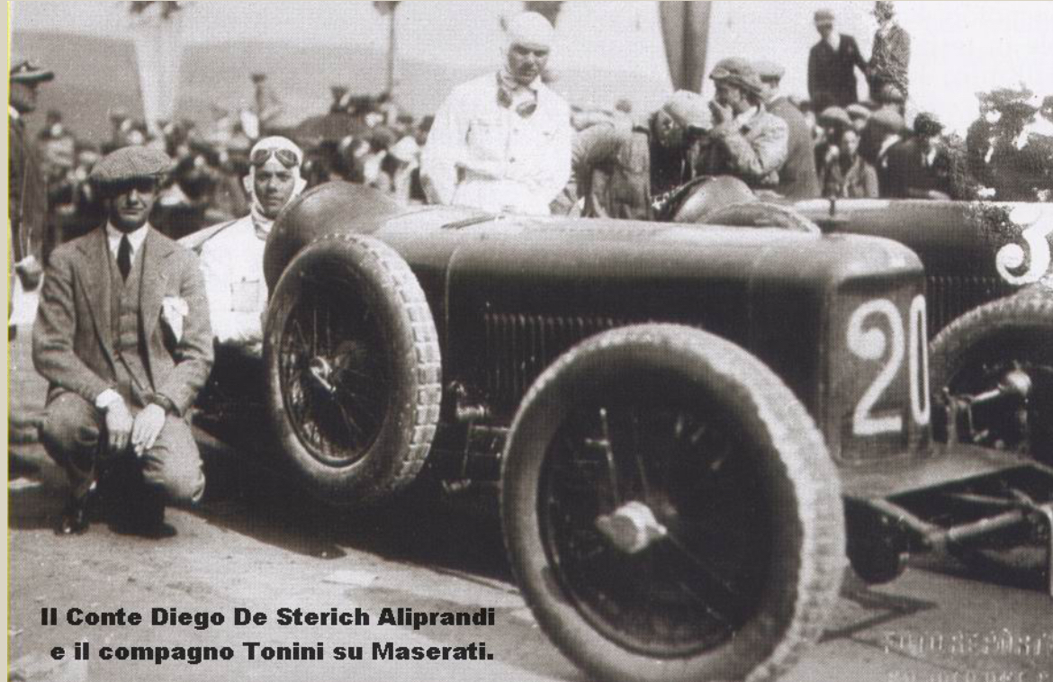 Le Comte de Sterlich Aliprandi, mécène des frères Maserati pour la conception et la construction de la Tipo 26 : Victoire en classe 1500 d’Alfieri Maserati (Guerino Bertocchi en mécanicien embarqué) avec la première Tipo 26 à la Targa Florio le 25 avril 1926 :