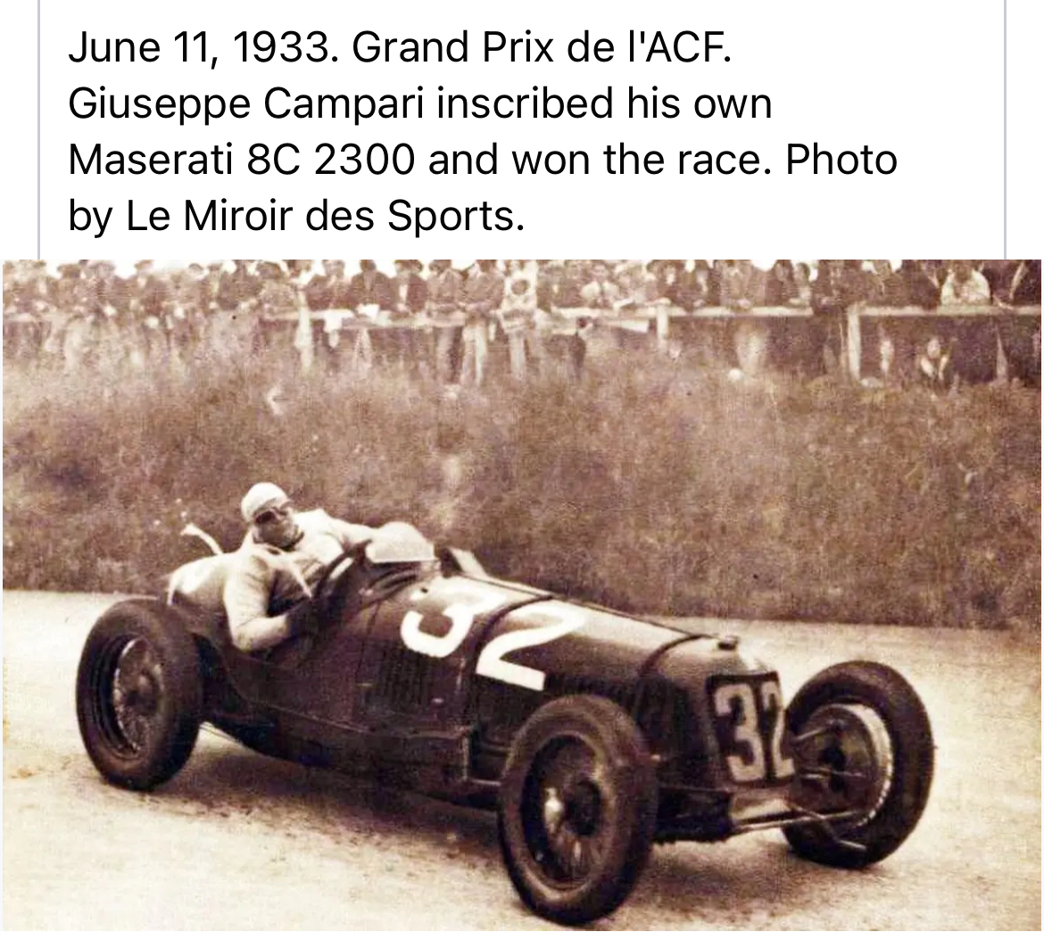 Petite erreur dans le commentaire : l’auto du vainqueur de l’épreuve était une Maserati 8C 3000 et non 2300. Ce grand Prix de l’Automobile Club de France s’était déroulé à Montlhéry. Vainqueur Campari.