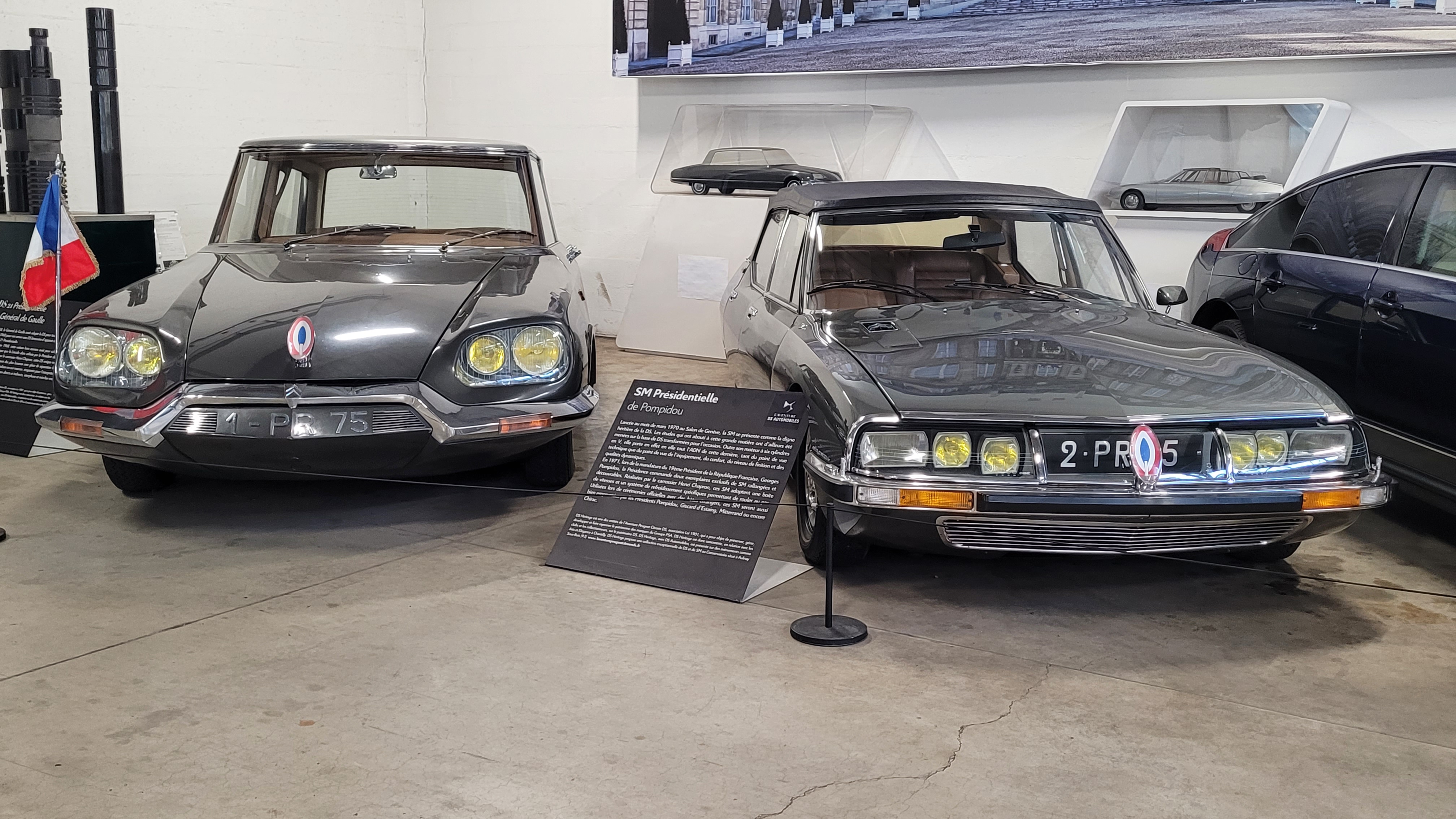 La SM de Pompidou fait berlinette à côté de la gigantesque DS de De Gaulle, livrée en novembre 68 (6,53m de long; objectif du cahier des charges: être plus grande que la Lincoln du président des USA).