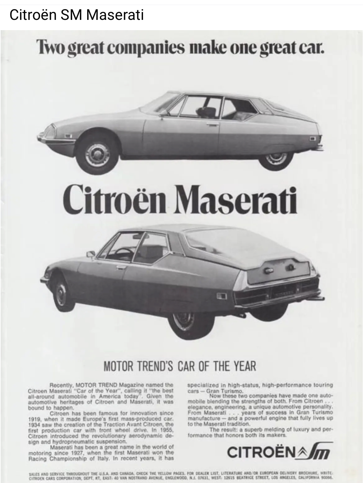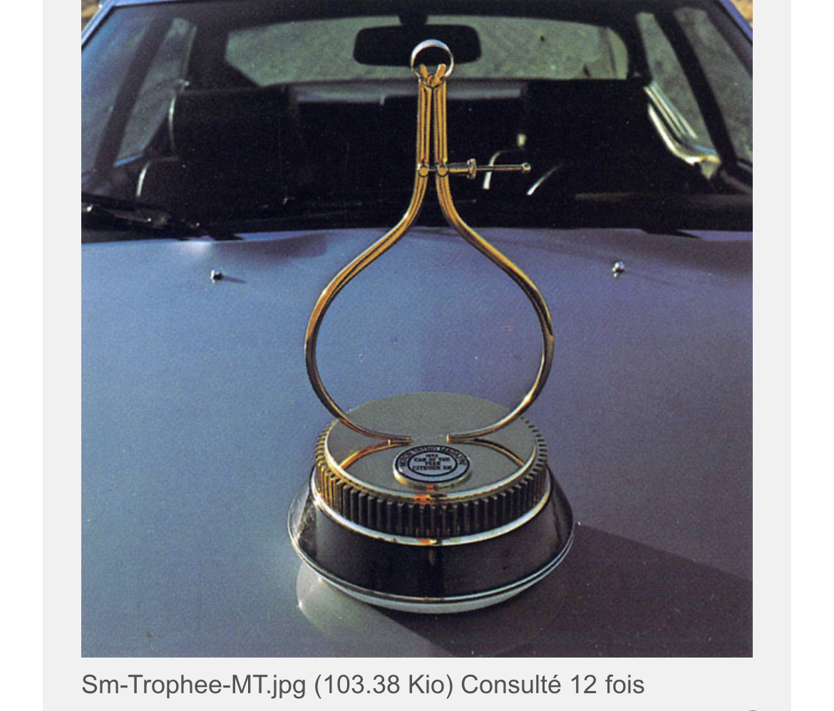 Postée par Smart, cette belle photo du trophée « car of the year 1972 » décerné par le magazine Motor Trend à la SM :