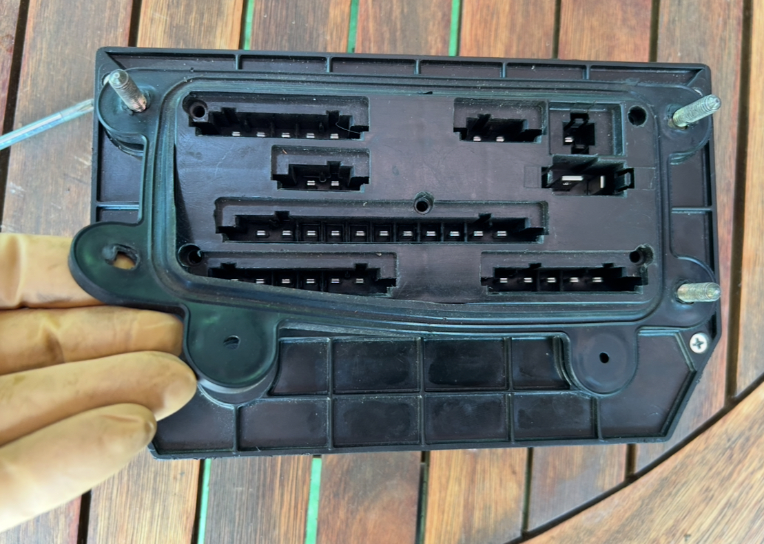 Côté habitacle, on débranche toutes les fiches sans les repérer, comme coté moteur, et on peut extraire la boîte à fusible par l’habitacle. Ci-dessous la boîte est extraite , on est dans l’habitacle et on voit les fiches côté moteur qui apparaissent plus sombres que les blanches de l’habitacle :