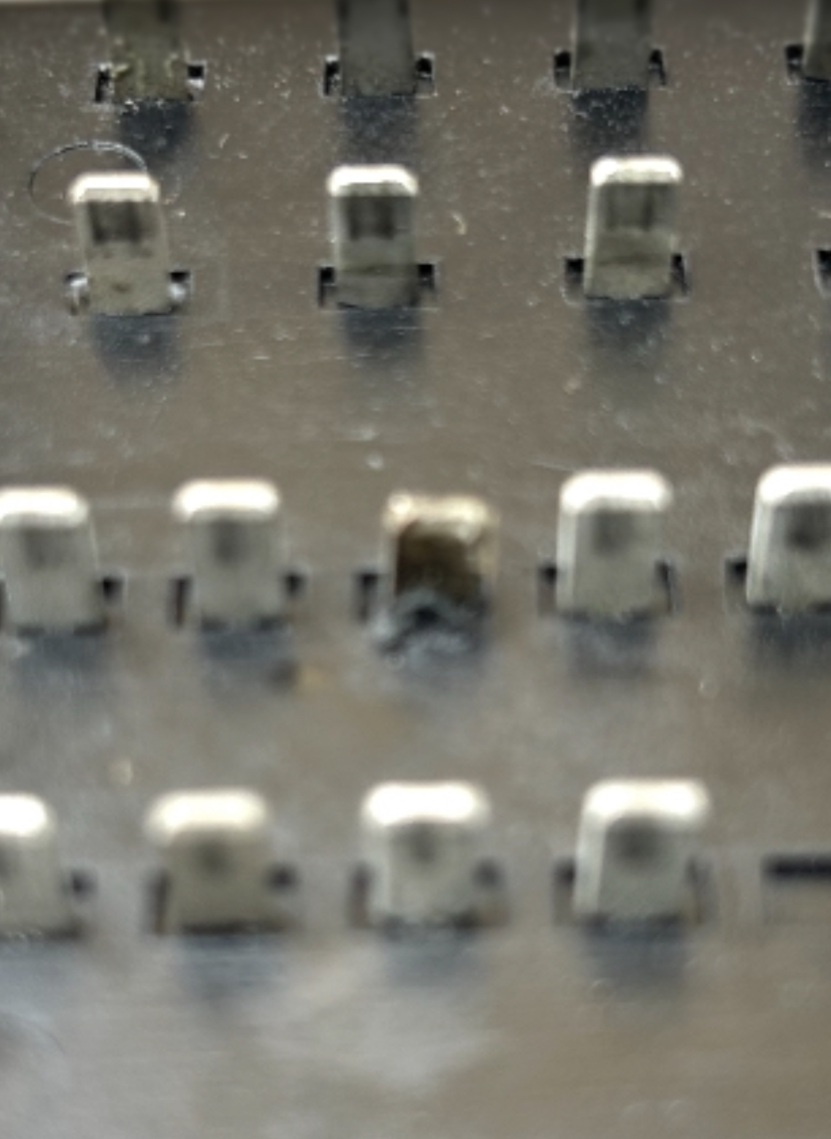 À l’intérieur du boîtier on découvre la carte circuits imprimés en « porte feuille » , comme on faisait à l’époque. Souvent ça craquait à la pliure mais celle ci n’est pas trop mal malgré une drôle de couleur à gauche :