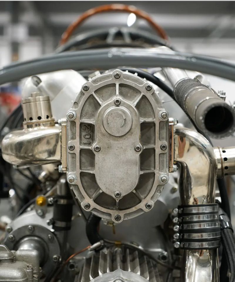 Voici un éclaté du moteur, les soupapes d’admission et d’échappement sont à 90 degrés les unes des autres, distribution par cascade d’engrenages :